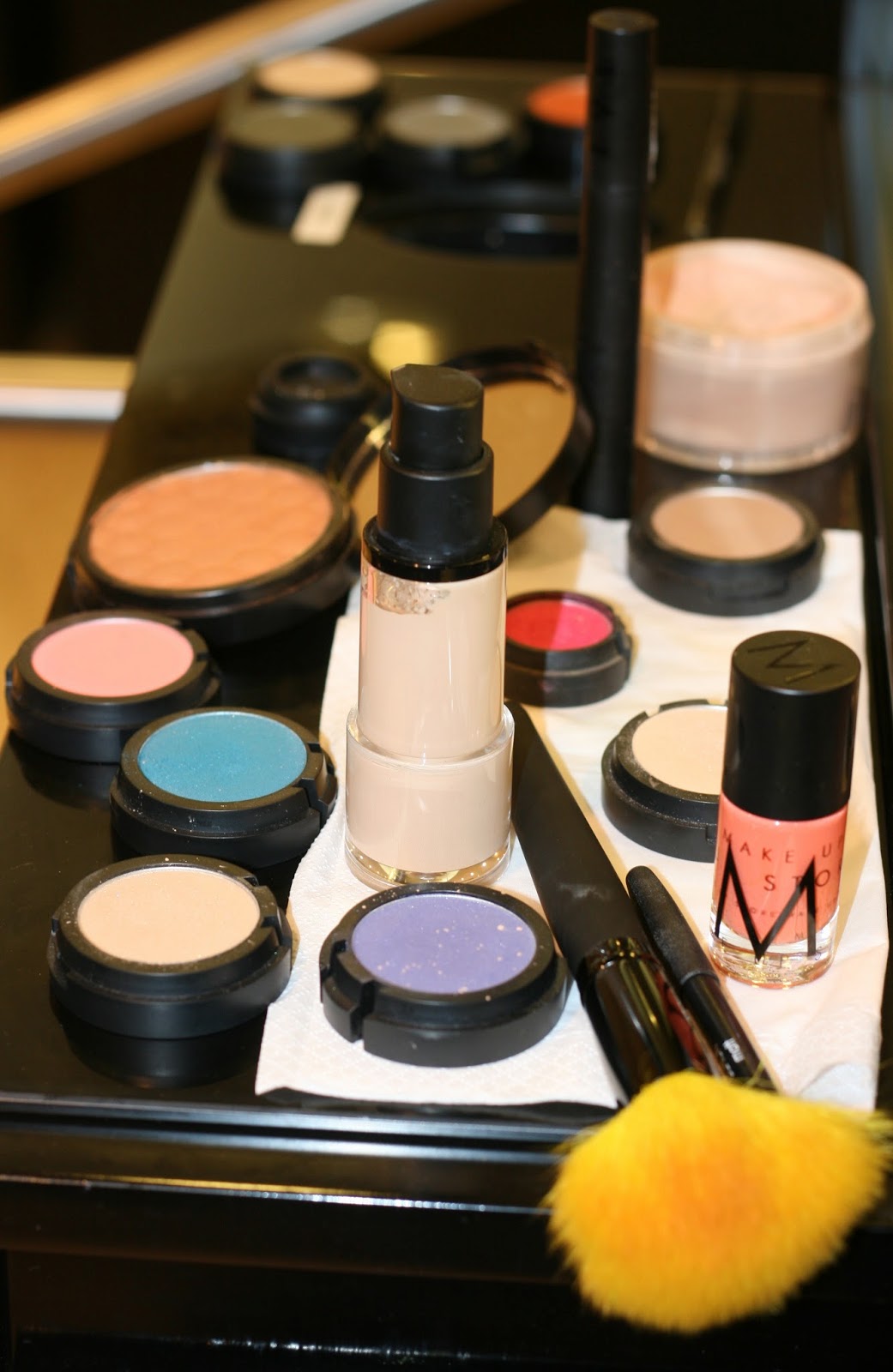 Huomatkaa pirtsakka keltainen sivellin, joita saa Make Up Storelta myös pinkkinä.